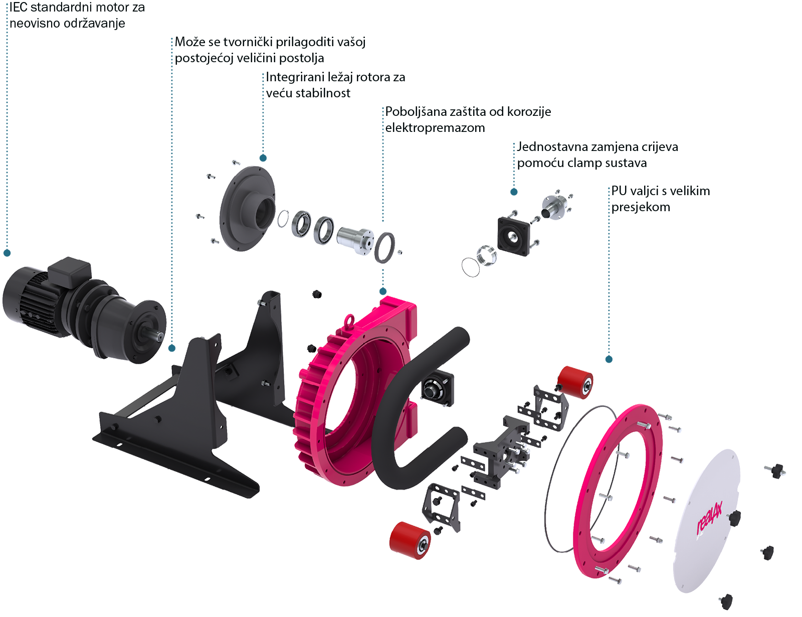 Peristaltičke pumpe s valjcima serije realAx IP za Heavy-Duty primjene opremljene su integriranim ležajevima rotora, velikim PU valjcima za široku raspodjelu tlačnog opterećenja te otpornim crijevima.
