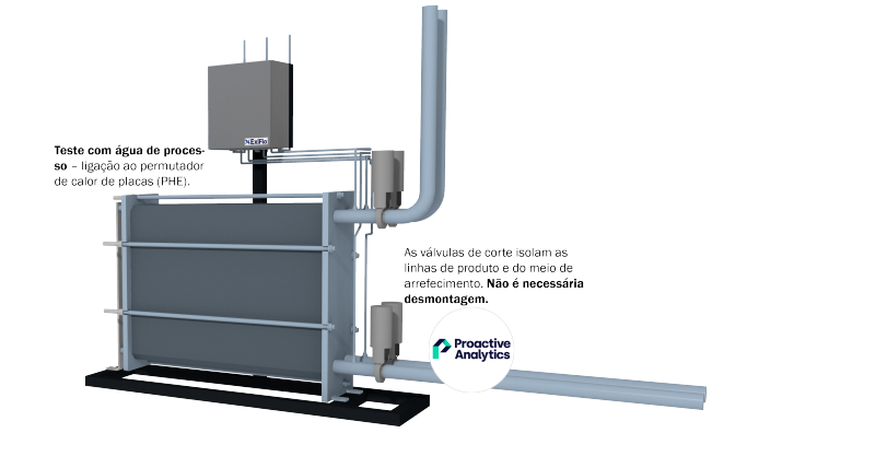 O sistema de teste permanece permanentemente ligado às unidades de permutadores de calor, eliminando a necessidade de desmontagem ou modificações para testes individuais.